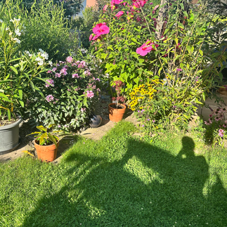 Pinkfarbener Hibiskus, gelbe Blüten, Oleander – mein verwildertes Paradies. Unter dem Segeldach aus Tausendundeiner Nacht schmeckt der Tee noch besser.